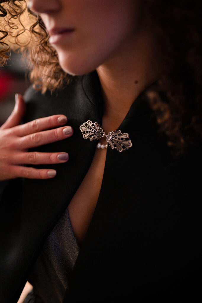 Sofisticata e versatile, questa cappa nera è il tocco finale perfetto per i tuoi outfit da sera. La chiusura a mano, impreziosita da dettagli raffinati, rende il capo unico ed elegante. Ideale da indossare sopra vestitini, aggiunge un tocco di mistero e stile alle tue serate speciali.